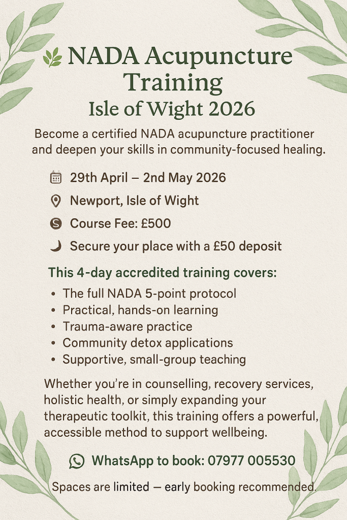 Integrative Counsellor. NADA registered and Auricular Acupuncturist, Shamanic practitioner , Addiction therapist. NADA trainer. Insured and DBS checked.